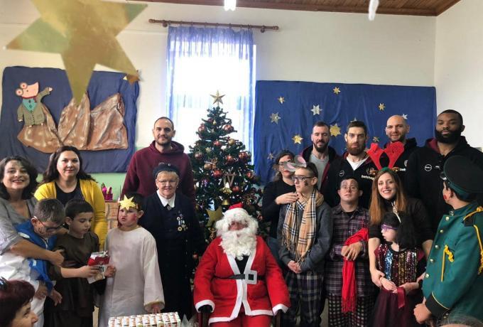 Ο team manager του Ηφαίστου, Μάρκος Κολώκας, μαζί με τους Δημήτρη Χαριτόπουλο, Μιχάλη Πελεκάνο, Σον Έβανς και Βλαντ Μολντοβεάνου μοίρασαν πολλά χαμόγελα και δώρα στα παιδιά και παρακολούθησαν τη θεατρική τους παράσταση.