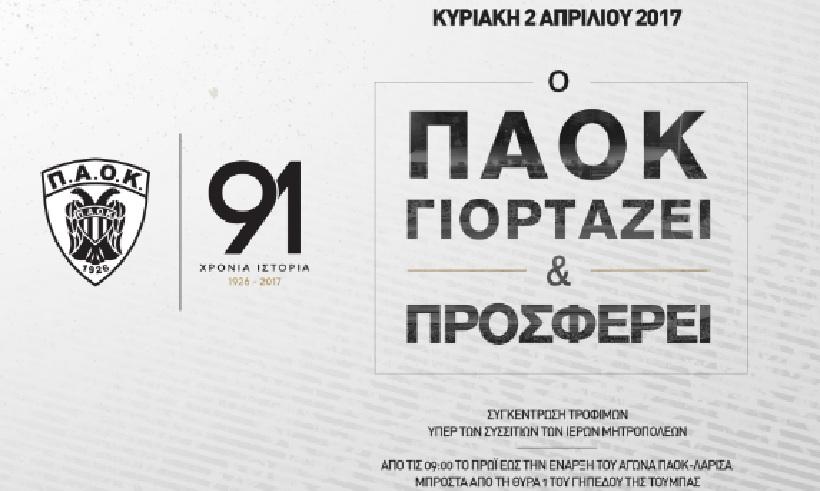 Ο ΠΑΟΚ με την ευκαιρία της συμπλήρωσης 91 χρόνων από την ίδρυση του και αντιλαμβανόμενος το ρόλο του στην κοινωνία , σε μία ιδιαίτερα δύσκολη χρονική περίοδο, αποφασίζει στα πλαίσια του εορτασμού της ιστορικής επετείου του να τιμήσει την ιστορία του προσφέροντας βοήθεια σε συνανθρώπους μας που έχουν ανάγκη.