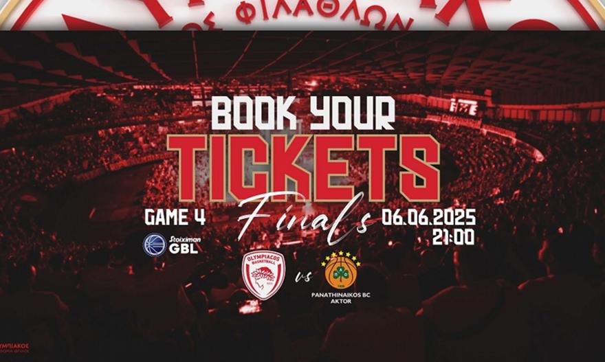 Η Κ.Α.Ε. ΟΛΥΜΠΙΑΚΟΣ θα ήθελε να ενημερώσει τους φιλάθλους της ότι τα εισιτήρια για τον 4ο τελικό αγώνα της STOIXIMAN GBL με τον ΠΑΝΑΘΗΝΑΪΚΟ AKTOR που θα διεξαχθεί την Παρασκευή 06/06/2025 με ώρα έναρξης 21:00 θα είναι διαθέσιμα προς πώληση από την Δευτέρα 02/06/2025 και ώρα 12:00, μέσω του www.olympiacosbc.gr, μέσω του www.ticketmaster.gr, είτε μέσω του τηλεφωνικού κέντρου, στο τηλέφωνο 2111996007.