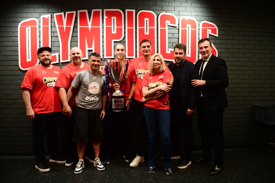 Συγκεκριμένα, ο Γιώργος Μπαρτζώκας, το τεχνικό επιτελείο της ομάδας, αλλά και οι πρόεδροι του συλλόγου, Παναγιώτης και Γιώργος Αγγελόπουλος, φωτογραφήθηκαν με το βαρύτιμο τρόπαιο πίσω από το λογότυπο του Ολυμπιακού!