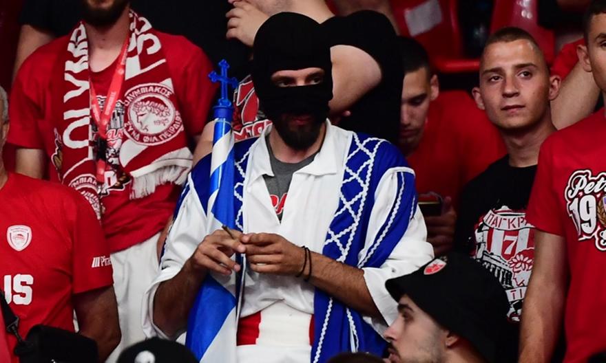 Οπαδός της ομάδας του Πειραιά εμφανίστηκε ντυμένος με την παραδοσιακή στολή του τσολιά, φορώντας full face και κρατώντας στα χέρια του μια μεγάλη ελληνική σημαία.