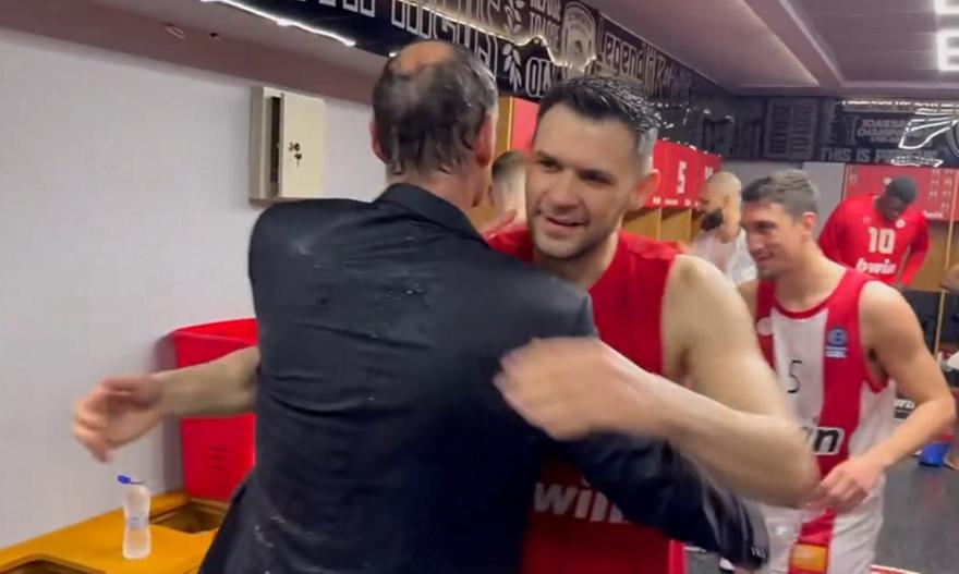 Στη συνέχεια ο Γιώργος Μπαρτζώκας «πνίγηκε» στις αγκαλιές των παικτών του Ολυμπιακού.