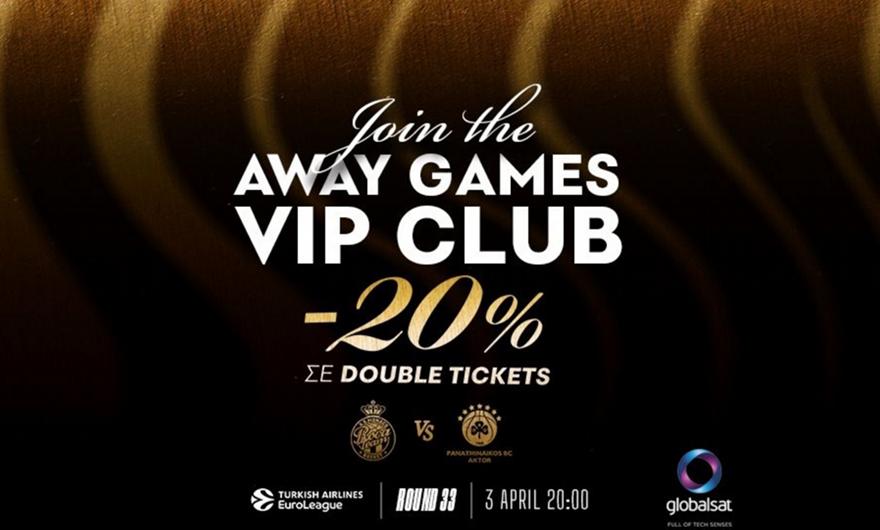 Επωφεληθείτε της προσφοράς και ζήστε την εμπειρία του ΟΑΚΑ ως μέλη στο Away Games VIP Club, στηρίζοντας παράλληλα την ομάδα μας με τον δικό σας μοναδικό τρόπο, δύο "στροφές" πριν την ολοκλήρωση της regular season της φετινής EuroLeague.