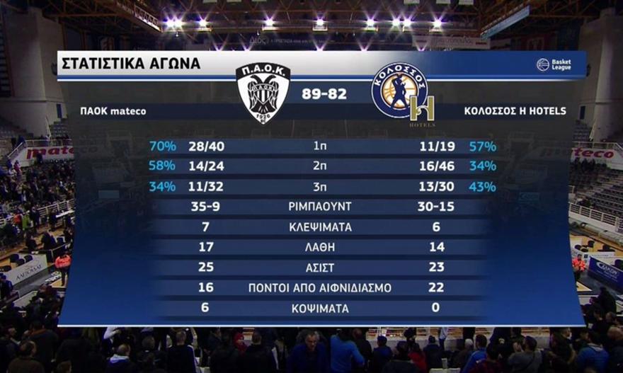 Αγχωτική νίκη (89-82), παρά το γεγονός ότι έφτασε να προηγείται μέχρι και με +26, πανηγύρισε κόντρα στον Κολοσσό Ρόδου ο ΠΑΟΚ , για τη 16η αγωνιστική της Basket League.