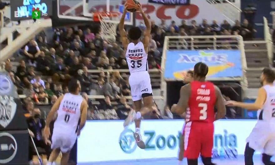 Εντυπωσιακό κάρφωμα του Νέιτ Ρένφρο στον καλάθι του Ολυμπιακού, με τον παίκτη του ΠΑΟΚ να «πετάει»!