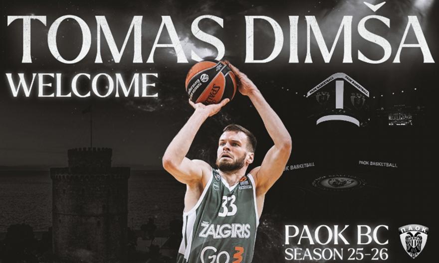 Ο ΠΑΟΚ ανακοίνωσε την απόκτηση του Λιθουανού καλαθοσφαιριστή Τόμας Ντίμσα για τη σεζόν 2025-26. Ο Ντίμσα, γεννημένος το 1994 στο Κάουνας, έχει ύψος 1,96 μέτρα και αγωνίζεται ως γκαρντ/φόργουορντ με δυνατό του όπλο το τρίποντο (36% στην καριέρα του στη EuroLeague).