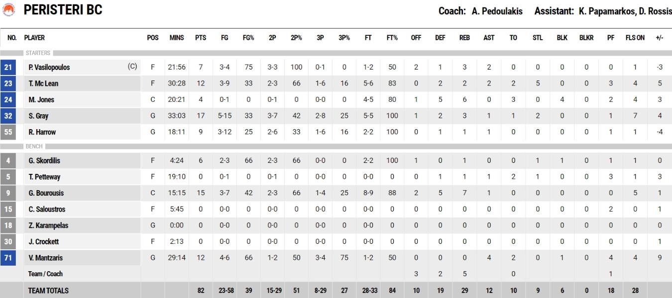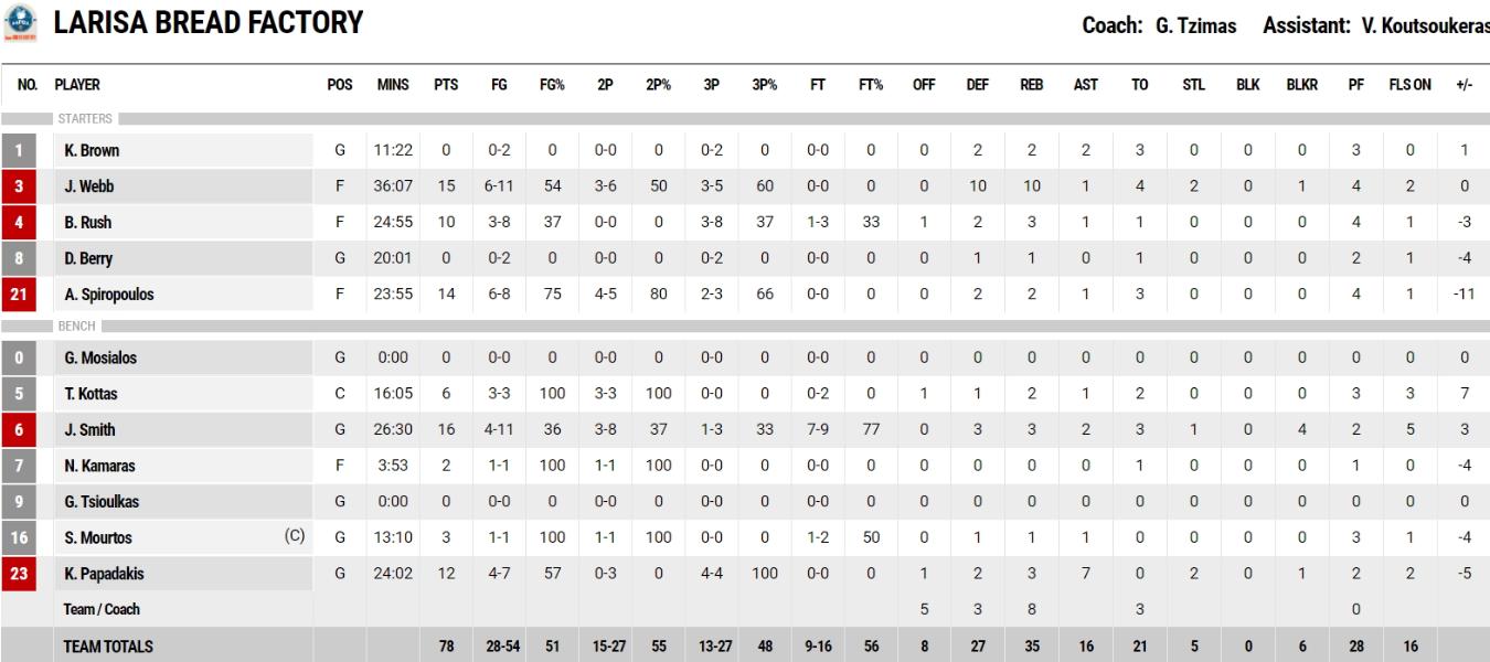 Από την άλλη, για τους Θεσσαλούς, που παρατάχθηκαν με τον υπηρεσιακό Τζήμα στον πάγκο, διακρίθηκαν οι Γουέμπ (15 πόντοι, 10 ριμπάουντ) και Παπαδάκης (12 πόντοι, 7 ασίστ).