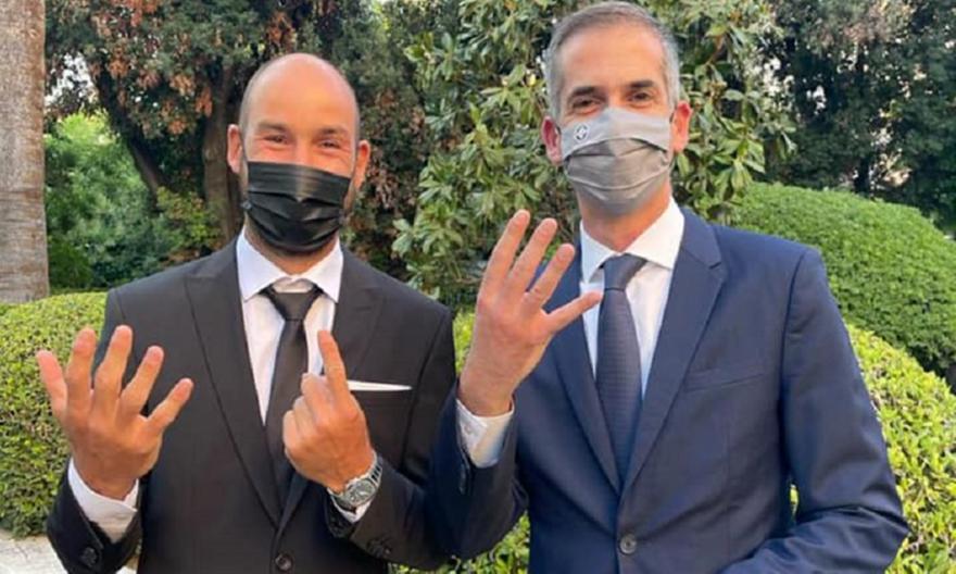 Εκεί, φυσικά, βρίσκεται και ο δήμαρχος Αθηναίων, Κώστας Μπακογιάννης, ο οποίος δεν έχασε την ευκαιρία, βγάζοντας μία αναμνηστική φωτογραφία με τον επί σειρά ετών αρχηγό του Ολυμπιακού. Αλλά μια φωτογραφία με... νόημα!
