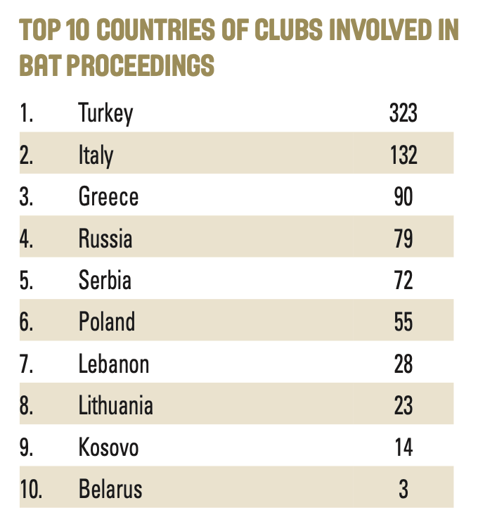 Η FIBA δημοσιοποίησε το Top 10 των χωρών με τις περισσότερες υποθέσεις που έφτασαν στο BAT, το οποίο αποτελεί το δικαστικό όργανο επίλυσης οικονομικών διαφορών μεταξύ ομάδων και παικτών, προπονητών ή μάνατζερ.