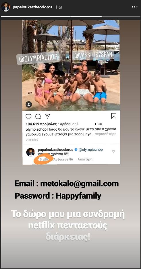 «Email: metokalo@gmail.com, password: Happyfamily. Το δώρο μου, μια συνδρομή netflix, πενταετούς διάρκειας!», έγραψε σε ποστάρισμά του ο πρώην συμπαίκτης του στον Ολυμπιακό και την Εθνική ομάδα, ο οποίος... ευστόχησε σε πρόβλεψη που είχε κάνει πριν από λίγους μήνες.