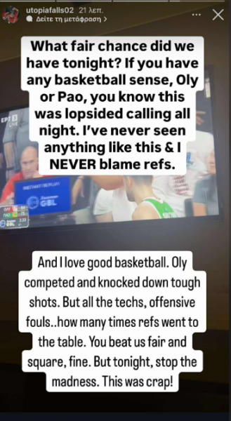 Και λατρεύω το καλό μπάσκετ. Ο Ολυμπιακός αγωνίστηκε κι έβαλε σκληρά σουτ. Αλλά όλοι οι τεχνικές ποινές, επιθετικά φάουλ.. πόσες φορές οι διαιτητές πήγαν στη γραμματεί; Αν μας νικήσεις δίκαια και σωστά, εντάξει. Αλλά απόψε, σταματήστε την τρέλα. Αυτό ήταν σκ@τ@!», έγραψε αναλυτικά.