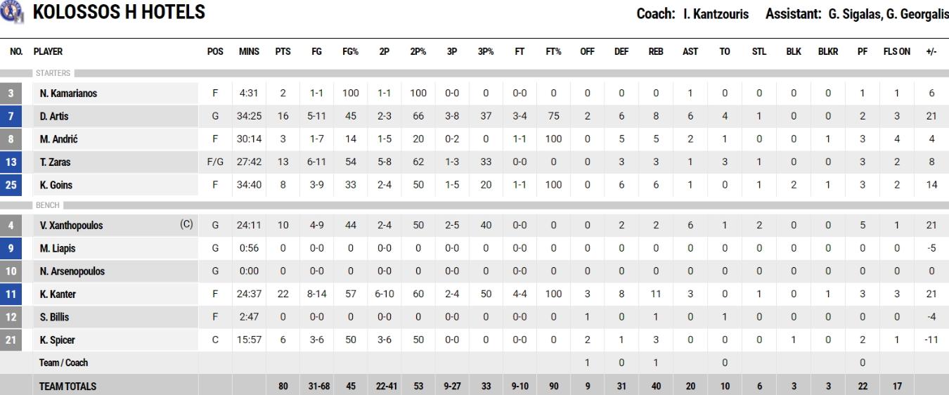 Έκανε τη διαφορά: Τρεις παίκτες θα μπορούσαν να μοιραστούν τον τίτλο του κορυφαίου για τον Κολοσσό. Ο «εγκέφαλος» αυτής της ομάδας, Βασίλης Ξανθόπουλος, ο πληθωρικός Ντόμινικ Άρτις και ο ανίκητος Κερέμ Καντέρ. Δίνουμε όμως το βραβείο του MVP στον Τούρκο φόργουορντ, ο οποίος έσπασε τα κοντέρ: 22 πόντοι με 8/14 εντός παιδιάς, 12 ριμπάουντ, 3 ασίστ και 0 λάθη! Τι άλλο να κάνει;