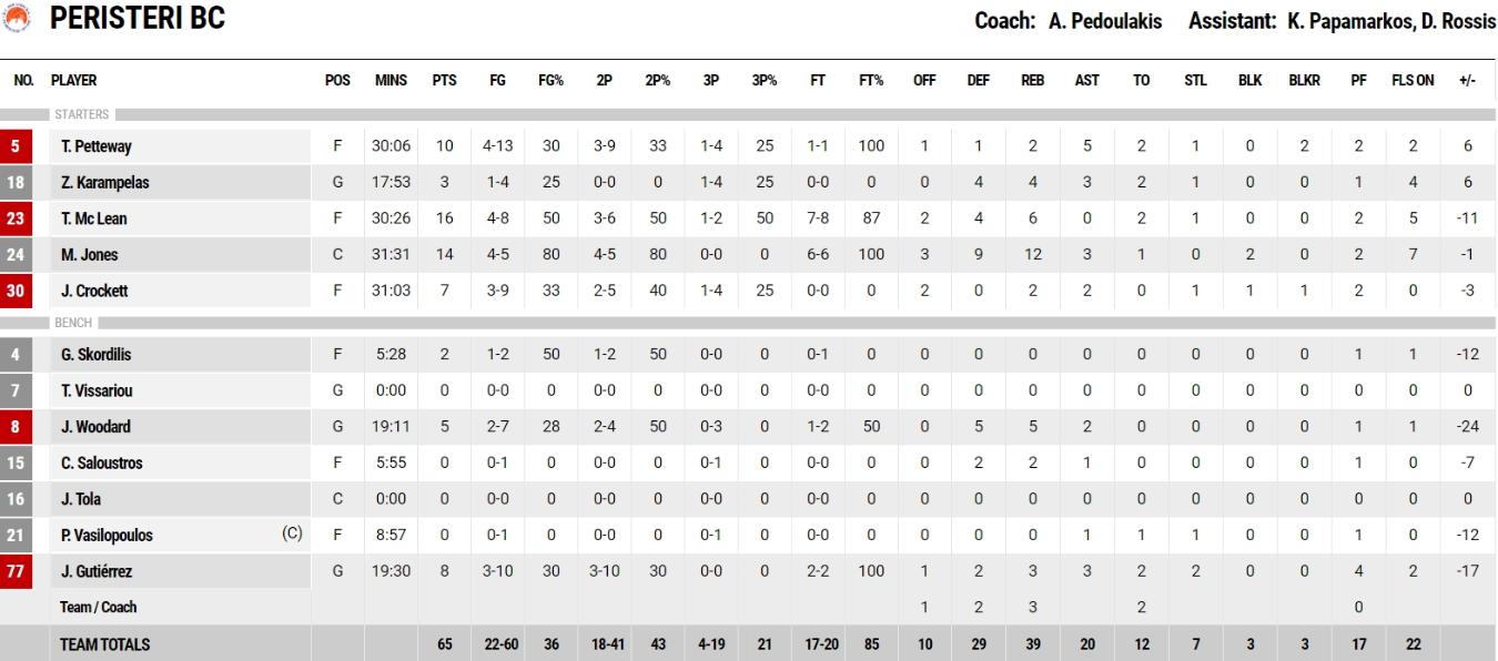 Το στατιστικό του αγώνα: Τα 4/19 τρίποντα του Περιστερίου, που έσπασε τα… καλάθια με τις προσπάθειες των παικτών του από την περιφέρεια.