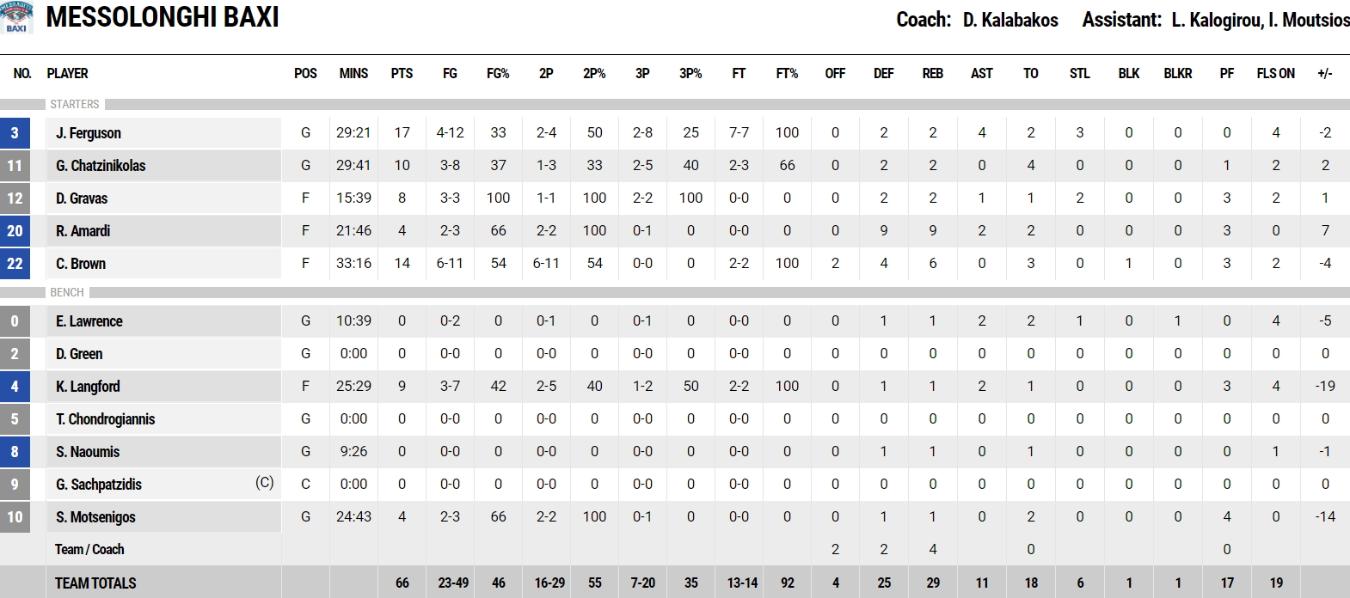 Αρκετά μαχητική η ομάδα του Καλαμπάκου, που πέρασε μπροστά στα μισά της 4ης περιόδου, όμως κατέρρευσε στο φινάλε. Φέργκιουσον (17 πόντοι) και Μπράουν (14 πόντοι, 6 ριμπάουντ) οι διακριθέντες για τους νεοφώτιστους.