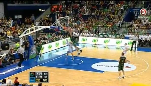 Ο νεαρός σέντερ της Λιθουανίας παρέλαβε μέσω ταμπλό την πάσα από τον Μάντας Καλνιέτις και την παρέδωσε στο αντίπαλο καλάθι καβαλώντας τον δύσμοιρο αντίπαλό του.