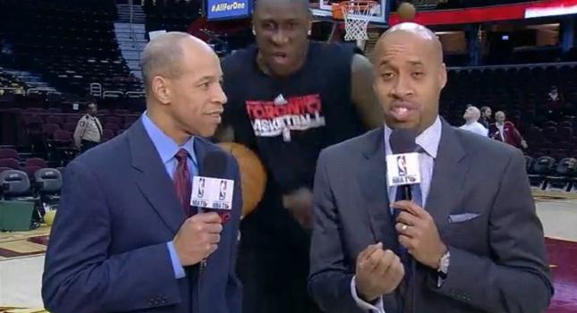 Οι Πολ Τζόουνς και Σέρμαν Χάμιλτον μετέφεραν, στους τηλεθεατές, τα τελευταία νέα πριν από το ματς των Ράπτορς με τους Καβαλίερς, όπου σε κάποια στιγμή παρενέβη ο Μικαέλ Πιετρούς με διάθεση… Boney M.