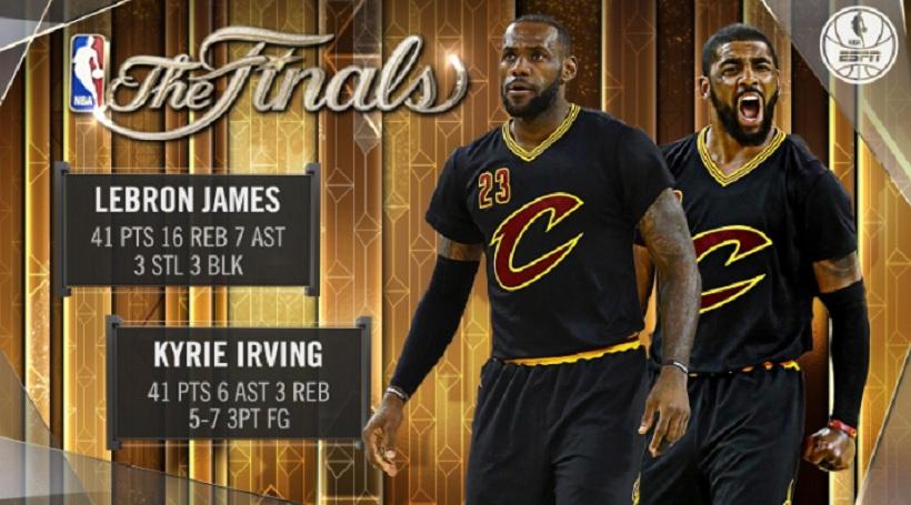 Λεμπρόν Τζέιμς και Κάιρι Ίρβινγκ πέτυχαν από 41 πόντους οδηγώντας τους Καβαλίερς στη νίκη επί των Γουόριορς. Μάλιστα είναι η πρώτη φορά στην ιστορία των τελικών που δύο παίκτες της ίδιας ομάδας έχουν πάνω από 40+ πόντους στο ίδιο ματς.
