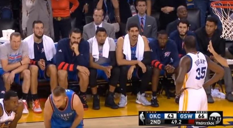 Στο φινάλε του πρώτου ημιχρόνου ο «KD» άνοιξε διάλογο με τον πάγκο των Θάντερ. Γύρισε και είπε κάτι, που προκάλεσε την αντίδραση του Ενές Καντέρ. Ο Τούρκος σέντερ δεν λούφαξε, αλλά τα έβαλε ανοιχτά με τον παλιό του συμπαίκτη και χρειάστηκε ο Στίβεν Άνταμς να του κάνει νόημα να μη δώσει συνέχεια στο επεισόδιο.