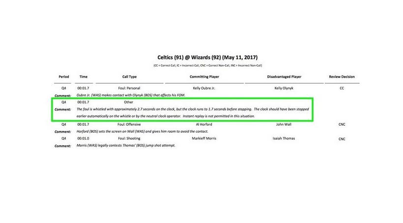 Όπως αναφέρει, οι Σέλτικς στερήθηκαν ένα ολόκληρο δευτερόλεπτο επίθεσης στο φινάλε της παράτασης απέναντι στους Γουίζαρντς. Μετά το τρίποντο του Τζον Γουόλ (92-91) οι φιλοξενούμενοι κέρδισαν ένα φάουλ, αλλά αντί το χρονόμετρο να σταματήσει στα 2,7 δευτερόλεπτα, σταμάτησε στα 1,7!