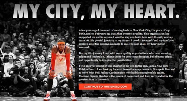 Με δήλωσή του στην επίσημη ιστοσελίδα του με τίτλο: «Η πόλη μου, η καρδιά μου», ο 30χρονος φόργουορντ γνωστοποίησε την απόφασή του να παραμείνει παίκτης των Νικς, τους οποίους χαρακτηρίζει αγαπημένη του ομάδα. Ο Άντονι, που είχε προτάσεις από τους Λος Άντζελες Λέικερς και Σικάγο Μπουλς, θα υπογράψει τις επόμενες ημέρες πενταετές συμβόλαιο έναντι 129 εκατομμυρίων δολαρίων.