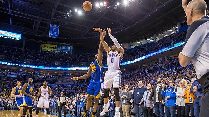 Ένα απίθανο τρίποντο του Ράσελ Γουέστμπρουκ 0,1’’ πριν τη λήξη της παράτασης χάρισε στη Θάντερ τη νίκη επί των Ουόριορς με 113-112. Ο γκαρντ της Οκλαχόμα, που είχε 34 πόντους, πήρε την ασίστ από τον Τάμπο Σεφολόσα ο οποίος πρόλαβε την μπάλα προτού περάσει εκτός παρκέ και γυρίζοντας το σώμα του από τη γωνία χάρισε τη νίκη στους γηπεδούχους. Έτσι πήραν ρεβάνς για την ήττα τους με 116-115 με buzzer-beater του Αντρέ Ιγκουοντάλα στο Όκλαντ στις 14 Νοεμβρίου, σε έναν αγώνα που ένα τρίποντο του Γουέστμπρουκ 2,3’’ πριν το τέλος φαινόταν να δίνει τη νίκη στη Θάντερ.