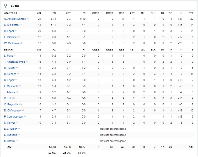 Ο ηγέτης ομάδας είχε 22 πόντους (8/11 δίποντα, 0/3 τρίποντα, 6/10 βολές), 11 ριμπάουντ και 4 ασίστ, ενώ τον ακολούθησαν Μίντλετον και Μπρουκ Λόπες με 14. Ο αδερφός του πέτυχε μεν μόλις 9 πόντους, αλλά σε… οικονομική συσκευασία. Αφού, είχε 4/4 δίποντα, 1/1 βολές, 5 ριμπάουντ και 1 ασίστ σε 16 λεπτά. Ο Μπράντλεϊ είχε 17 πόντους και ο Μίτσελ 14 από τους ηττημένους.