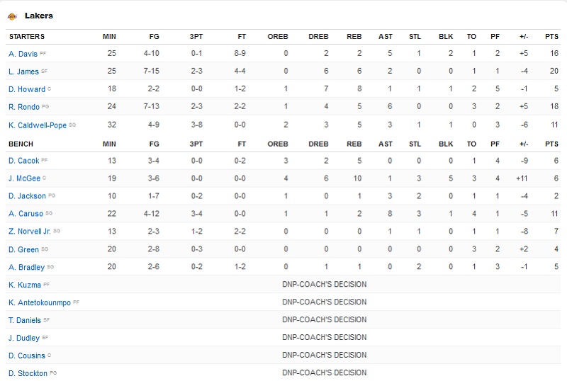 Από τους «λιμνανθρώπους», πρώτος σκόρερ ήταν ο ΛεΜπρόν με 20 πόντους, με τον Ρόντο να ακολουθεί με 18π. και τον Ντέιβις να είχε άλλους 16π.
