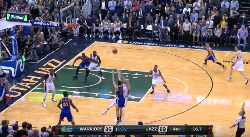 Οι Τζαζ έκαναν το λάθος να δώσουν δύο τρίποντα στον Κλέι Τόμπσον. Κι αν την πρώτη φορά εκείνος αστόχησε, δεν ήταν δυνατό να το κάνει και δεύτερη φορά.