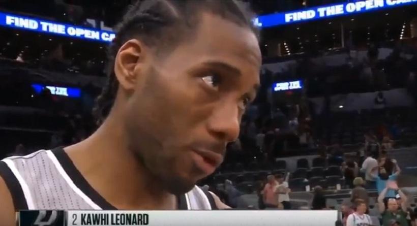 Ο Κογουάι Λέοναρντ μετά τη μεγάλη του εμφάνιση στη νίκη των Σπερς επί των Τζαζ (25π.) έκανε δηλώσεις στην κάμερα, όταν κάποιος συμπαίκτης του πέταξε στο πρόσωπό του μια πετσέτα.