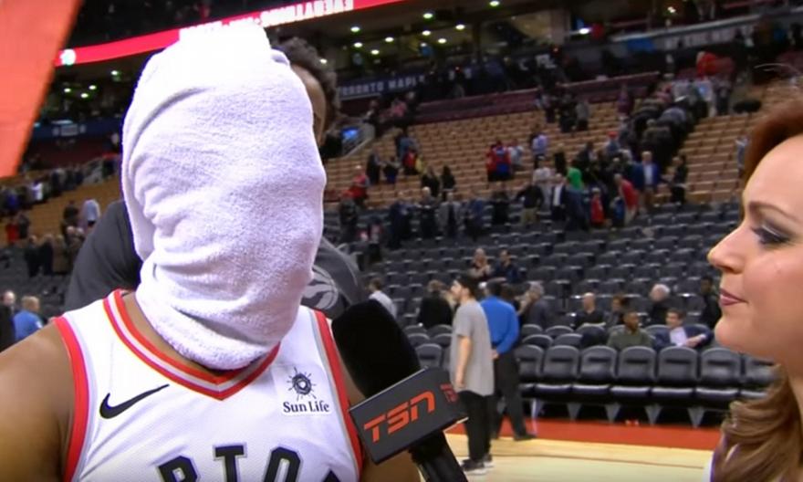 Την ώρα που ο Κάιλ Λάουρι έδινε συνέντευξη, ο ΝτεΜάρ ΝτεΡόζαν τον κουκούλωσε με μια πετσέτα, ωστόσο ο γκαρντ του Τορόντο δεν πτοήθηκε και συνέχισε να μιλά με την πετσέτα στη μούρη.