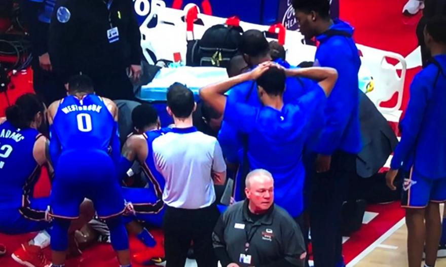 Freak accident here. Andre Roberson goes down hard after slipping. Takes a really bad bump. pic.twitter.com/4yjlGSkGXY