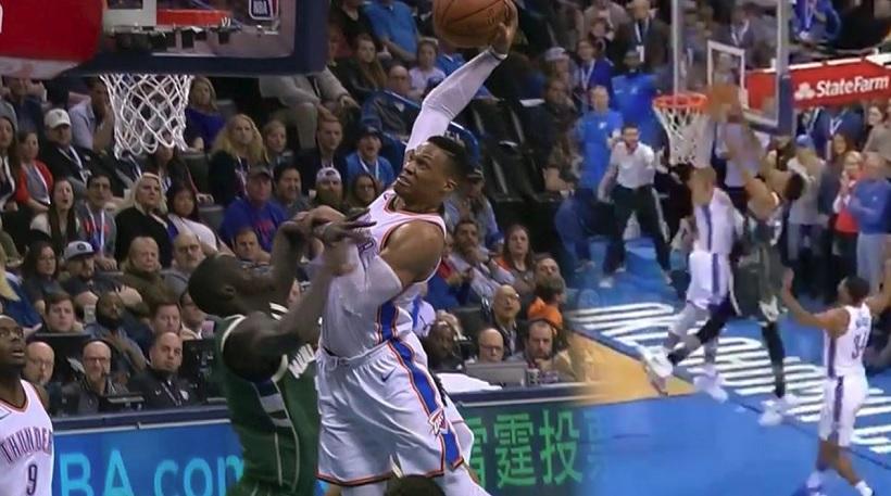 Ο Ράσελ Γουέστμπρουκ έβαλε στο καλάθι τον πελώριο Θον Μέικερ με ένα απίστευτο κάρφωμα από την ήττα των Θάντερ από τους Μπακς, που τον έφερε στην πρώτη θέση του Top 10.