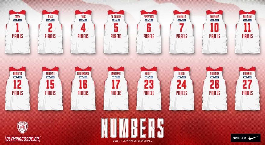 Όπως έκανε γνωστό η «ερυθρόλευκη» ΚΑΕ, οι Βασίλης Σπανούλης και Γιώργος Πρίντεζης διατήρησαν τα «7» και «15» αντίστοιχα, ενώ οι νεοαποκτηθέντες Έρικ Γκριν, Κεμ Μπιρτς και Πάρης Μαραγκός διάλεξαν τα «1», «2» και «26» αντίστοιχα.