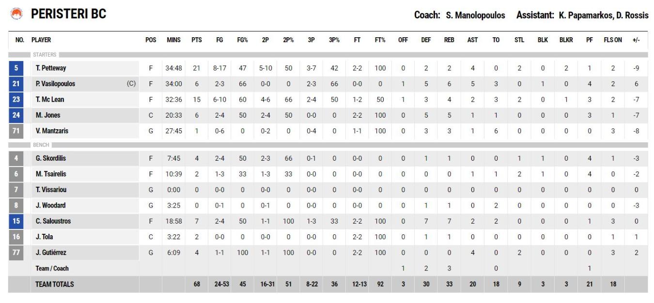 Πρώτος σκόρερ των νικητών ο Παπαπέτρου με 17 πόντους (οι 12 στην τελευταία περίοδο), ενώ καθοριστικός ήταν ο Κασελάκης, που μπήκε πρώτη φορά στην τρίτη περίοδο, βάζοντας ένα κρίσιμο τρίποντο και δίνοντας μεγάλη ενέργεια στον… κοιμισμένο μέχρι εκείνη την ώρα Παναθηναϊκό.