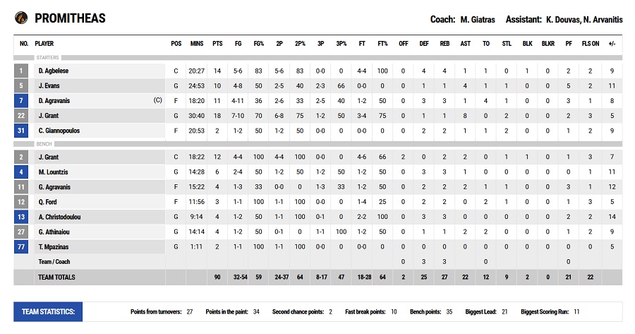 Πλουραλισμός στην επίθεση από την ομάδα του Γιατρά, με πέντε παίκτες να είχαν διψήφιο αριθμό πόντων. Κορυφαίος ήταν ο Τζέριαν Γκραντ με 18 πόντους και 8 ασίστ, με τον Αγκμπελίζ να είχε 14π. και τον Τζεράι Γκραντ να προσθέτει 12π.