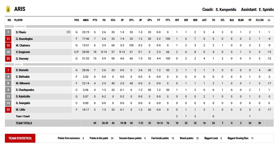 Από τον Άρη, ξεχώρισαν οι Ντραγκίτσεβιτς και Ντεκόζι με 18π. και 15π. αντίστοιχα.