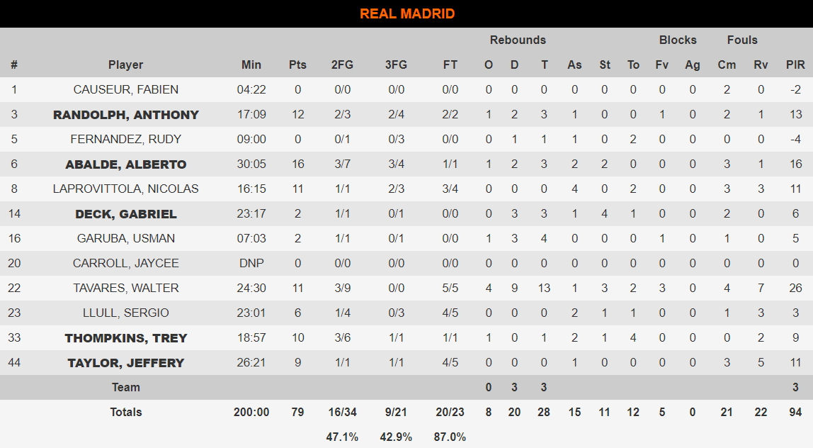 Κορυφαίοι για τους Μαδριλένους οι Αμπάλδε (16 πόντοι) και Ταβάρες (11 πόντοι, 13 ριμπάουντ), με την ομάδα του Λάσο να ανεβαίνει στο 8-5.
