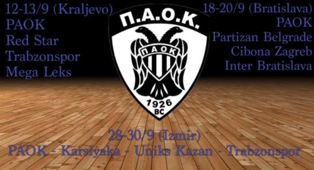 Η αρχή θα γίνει στις 12-13/9 στη Σερβία, κόντρα σε Ερυθρό Αστέρα, Τράμπζονσπορ και Μέγκα Λεκς. Στη συνέχεια (18-20/9) θα ταξιδέψει στη Σλοβακία, όπου θα αντιμετωπίσει Ίντερ Μπρατισλάβας, Παρτιζάν Βελιγραδίου και Τσιμπόνα Ζάγκρεπ. Τελευταίος σταθμός (28/30/9) πριν την έναρξη του πρωταθλήματος θα είναι η Σμύρνη, με αντιπάλους την Καρσίγιακα, την Τραμπζονσπόρ και την Ούνιξ.