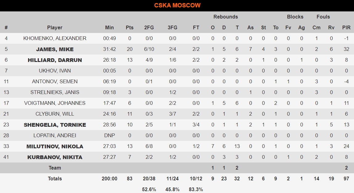 Έτσι, η «ομάδα του στρατού» ανέβηκε στο 12-3 και συνεχίζει την ξέφρενη πορεία της. Κορυφαίοι για τους Μοσχοβίτες οι Μάικ Τζέιμς (20 πόντοι, 7 ασίστ, 6 ριμπάουντ, 4 κλεψίματα) και Νίκολα Μιλουτίνοφ (13 πόντοι, 13 ριμπάουντ).