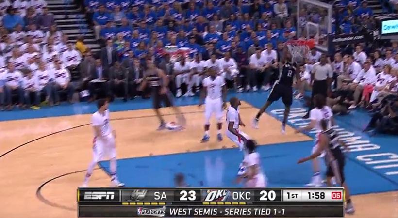 Απίθανη συνεργασία από τους Σπερς. Λεονάρντ, Τζινόμπιλι και Γουέστ κυκλοφόρησαν άψογα την μπάλα, που είχε τελικό αποδέκτη τον πρώτο για ένα κάρφωμα στη νίκη τους στην Οκλαχόμα.