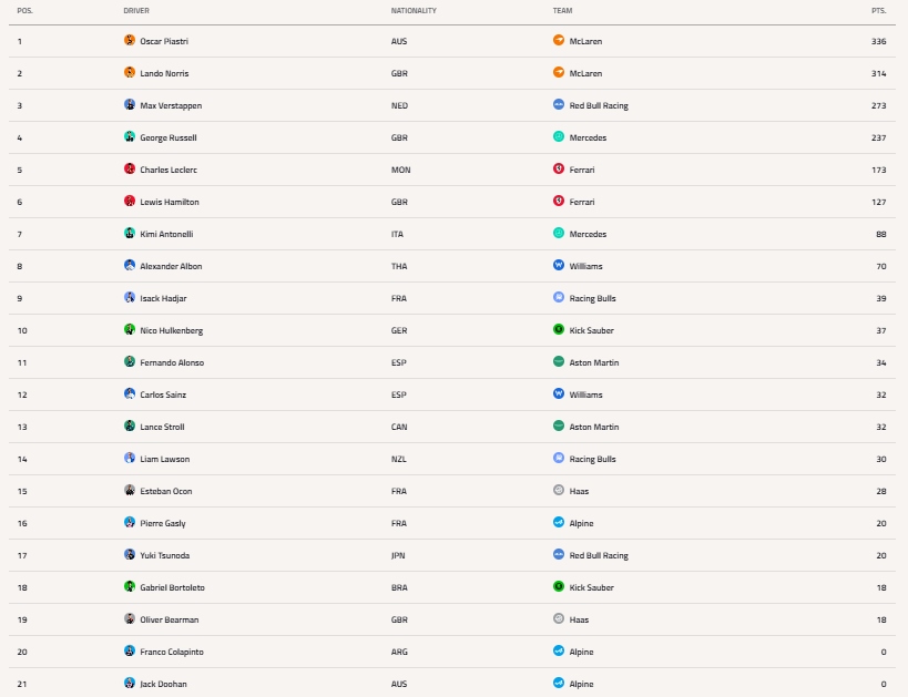 Έξι στροφές πριν το πέσιμο της καρό σημαίας στη Formula 1, ο Όσκαρ Πιάστρι παραμένει στην κορυφή του βαθμολογικού πίνακα με 336 βαθμούς και στο +22 από τον ομόσταβλό του, Λάντο Νόρις, ο οποίος και μάζεψε τη διαφορά κατά τρεις βαθμούς στην πίστα της Μαρίνα Μπέι.