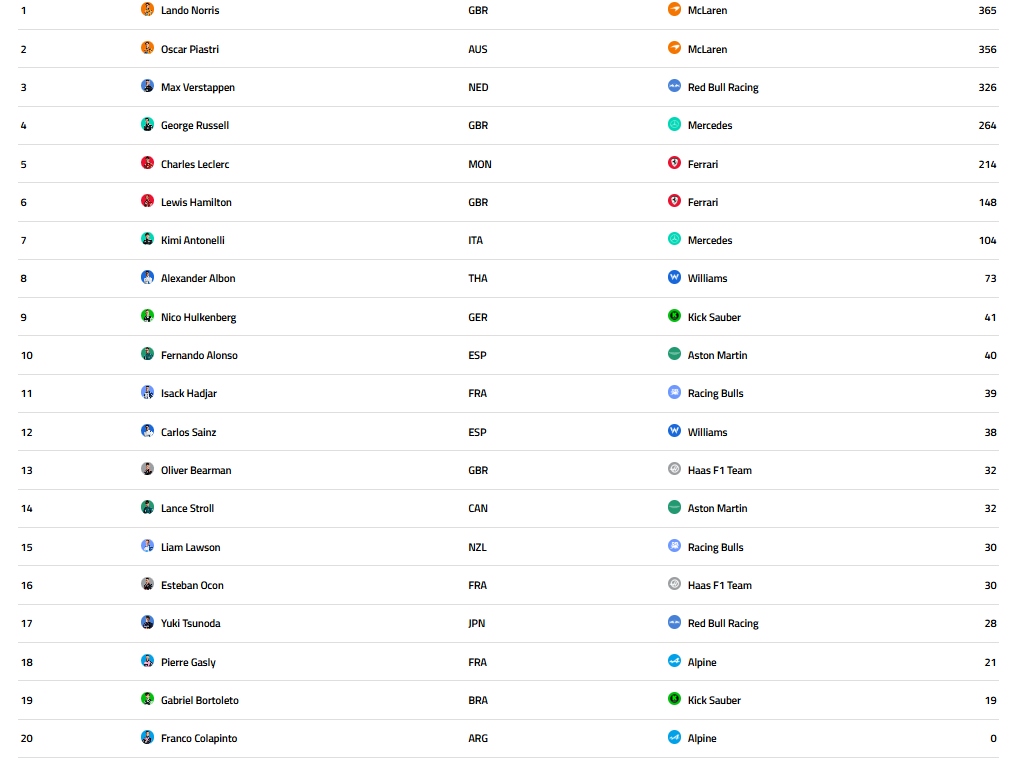 Έτσι λοιπόν, ο Νόρις πήρε οκτώ βαθμούς για τη νίκη του και ανέβηκε στους 365, με τον Αυστραλό οδηγό να μένει στους 356 και να βλέπει τη διαφορά να αυξάνεται στους 9 βαθμούς!
