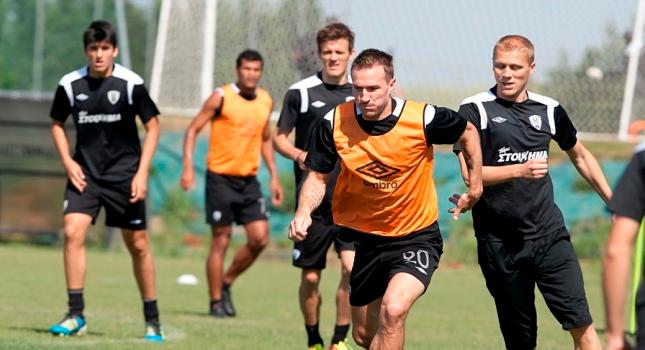 "Το πρόγραμμα, μετά την καθιερωμένη προθέρμανση, ξεκίνησε μα ασκήσεις φυσικής κατάστασης με μπάλα, με πιεστικά παιχνίδια σε μικρό χώρο 6 εναντίων 4, με την ομάδα με τους περισσότερους ποδοσφαιριστές να πρέπει να κυκλοφορεί χωρίς να χάσει τη μπάλα και τους αντιπάλους να τη διεκδικούν για να μπορέσουν να σκοράρουν.