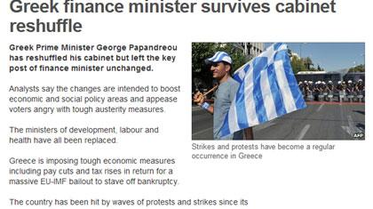 Τις πρώτες θέσεις καταλαμβάνει η είδηση του ανασχηματισμού και στα μεγαλύτερα διεθνή μέσα ενημέρωσης, τα οποία επισημαίνουν τη διατήρηση του Γιώργου Παπακωνσταντίνου στο θώκο του Υπουργείου Οικονομικών.