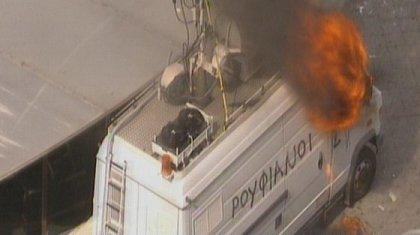 Άγνωστοι έβαλαν φωτιά και στο δεύτερο βαν κινητής τηλεφωνίας που βρισκόταν στο κέντρο, προκειμένου να ενισχύσει το σήμα και να βοηθήσει την επικοινωνία των χιλιάδων πολιτών που διαδηλώνουν για περισσότερο από ένα μήνα στο Σύνταγμα. Μάλιστα, έγραψαν με σπρέι πάνω σε αυτό τη λέξη «ρουφιάνοι», θεωρώντας ότι ήταν τηλεοπτικό συνεργείο.