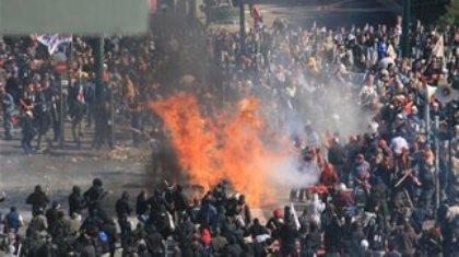 Σκηνικό πολέμου αυτή την ώρα στο Σύνταγμα. Ομάδες αναρχικών έχουν επιδοθεί σε έναν πρωτοφανή πετροπόλεμο με μέλη του ΠΑΜΕ. Το ΕΚΑΒ δέχθηκε κλήση από τους διασώστες του Ερυθρού Σταυρού στην πλατεία Συντάγματος για διαδηλωτή που φέρει σοβαρές κρανιοεγκεφαλικές κακώσεις λόγω πτώσης από ύψος.