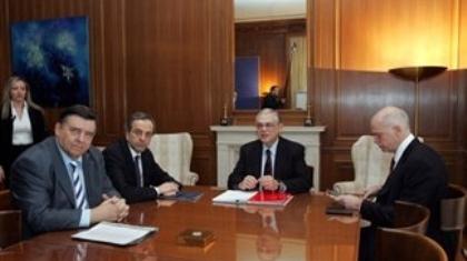 Όχι στην επιτροπεία και το κόψιμο μισθών στον ιδιωτικό τομέα είπαν ομόφωνα ο Λουκάς Παπαδήμος και οι τρεις αρχηγοί των κομμάτων που στηρίζουν την κυβέρνησή του. Στη σύσκεψη που διήρκεσε 2,5 ώρες διαμορφώθηκε η ελληνική διαπραγματευτική γραμμή απέναντι στην τρόικα. Οι δανειστές έχουν ήδη ξεκαθαρίσει πως δε θα δεχθούν εκπτώσεις στις διαρθρωτικές αλλαγές, ούτε αστερίσκους στην όποια συμφωνία από τους πολιτικούς αρχηγούς. Το «παζάρι» εισέρχεται έτσι στην τελική του φάση.