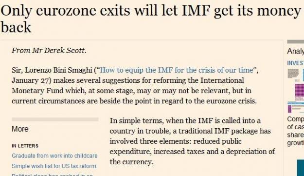 Όπως αναφέρει ο κ. Σκοτ, εάν «δεν υπάρξουν έξοδοι χωρών από την ευρωζώνη, το Διεθνές Νομισματικό Ταμείο, δεν πρόκειται να πάρει τα λεφτά του πίσω».