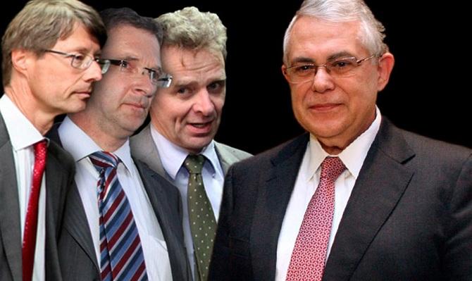«Στον τοίχο» βρίσκονται οι τρεις πολιτικοί αρχηγοί που στηρίζουν την κυβέρνησης του κ. Λουκά Παπαδήμου, μετά τη συνάντηση των εκπροσώπων της Τρόικας με τον πρωθυπουργό, τον υπουργό Οικονομικών κ. Ευάγγελο Βενιζέλο και τον υπουργό Εργασίας κ. Γιώργο Κουτρουμάνη το βράδυ της Κυριακής στο Μέγαρο Μαξίμου.