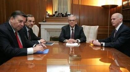 Δεκαπενθήμερη παράταση για λύση στο θέμα της εξεύρεσης 300 εκατ. ευρώ, ούτως ώστε να αποφευχθεί η περικοπή στις συντάξεις, μετά την ένσταση Σαμαρά - Καρατζαφέρη. Παρ’ όλα αυτά, στην πολύωρη σύσκεψη των τεσσάρων στο Μέγαρο Μαξίμου αποφασίστηκαν μειώσεις από 22% έως 32% στον βασικό μισθό του ιδιωτικού τομέα.